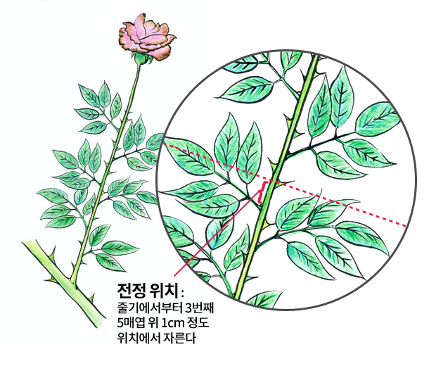 - 꽃이 피고 난 HT 계통의 꽃줄기는 보통 꽃송이 밑에 1매엽 1장, 3매엽 2~3장, 그 밑에 5매엽(본엽)이 붙는데 통상 첫 번째 5매엽 바로 밑을 잘라주는 것이 기본요령이며 그 후 45일이 지나면 다시 꽃을 피울 수 있다.