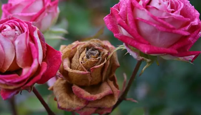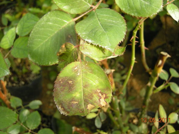 • 장미 꽃잎에 은빛 반점이 생기거나 갈변 증상이 나타납니다.